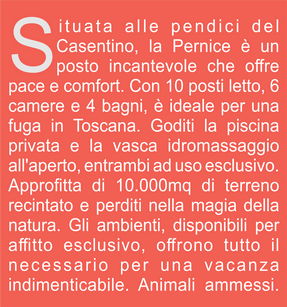 La Pernice è stata concepita come un paradiso privato, dove ogni dettaglio è pensato per offrire un'esperienza unica. Immersa nella natura, questo luogo esclusivo è il rifugio ideale per chi cerca relax e lusso. Qui, il tempo sembra fermarsi, permettendo di riscoprire il benessere e la tranquillità. Ogni angolo racconta una storia, e ogni soggiorno diventa un ricordo prezioso. Venite a scoprire la magia della Pernice e lasciatevi avvolgere dalla sua bellezza.